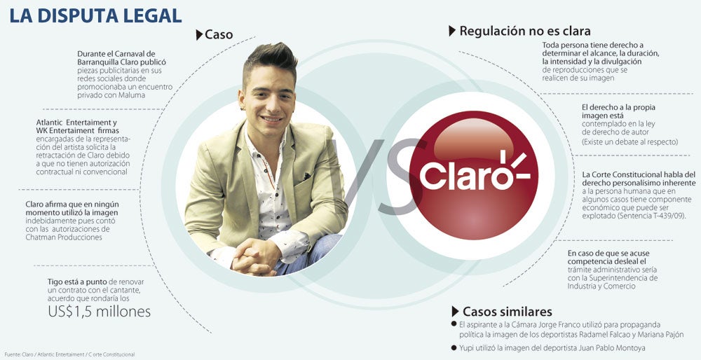 Andrés Charria, experto en derechos de imagen de deportistas profesionales, dice que en caso tal de que se lleve a cabo una demanda esto lo asumiría la justicia ordinaria. “En principio Tigo podría terminar el contrato y decir que Maluma está incumpliendo la obligación de exclusividad y Maluma a su vez podría demandar por perjuicios a Claro porque le hizo romper el contrato”, afirmó Charria.