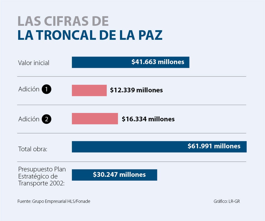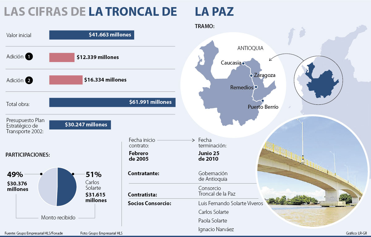 El contrato inicial para la Troncal de la Paz tuvo una adición presupuestal por $12.339 millones y dos años después, el 27 de diciembre de 2007, la secretaria de Infraestructura del departamento firmó un otrosí que le añadió otros $16.334 millones al mismo contrato, para asegurar la construcción de un puente sobre el río Nechí y así conectar al municipio de Bagre con la Troncal de la Paz, en lo que habría sido un proyecto diferente y por lo tanto, probablemente necesitaba su propio proceso de licitación como lo establecía la ley de contratación de obras públicas que estaba vigente en ese momento, así como el régimen contractual.