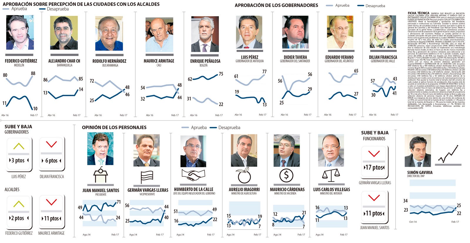 Así, la imagen favorable del presidente Juan Manuel Santos bajó 11 puntos, al pasar entre diciembre del año pasado a febrero de 35% a 24%, mientras que su desfavorabilidad llegó a 71%; de igual manera, Mauricio Cárdenas, ministro de Hacienda, pasó de 13% de imagen negativa a 21%; en este mismo punto Juan Fernando Cristo, de la cartera del Interior, obtuvo 26%, frente a 18% en diciembre y Aurelio Iragorri, de Agricultura, pasó de 10% a 19% de desfavorabilidad.