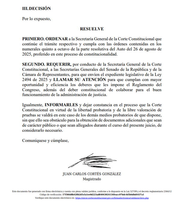 También se requirió que por medio de la Secretaría General de la Corte Constitucional, “a las Secretarías Generales del Senado de la República y de la Cámara de Representantes, para que envíen el expediente legislativo de la Ley 2494 de 2025 ”. Se exigió llamar la atención para que se cumplan con mayor eficacia los deberes que les propuso el Reglamento del Congreso, además de apoyar el buen engranaje de la administración de justicia.
