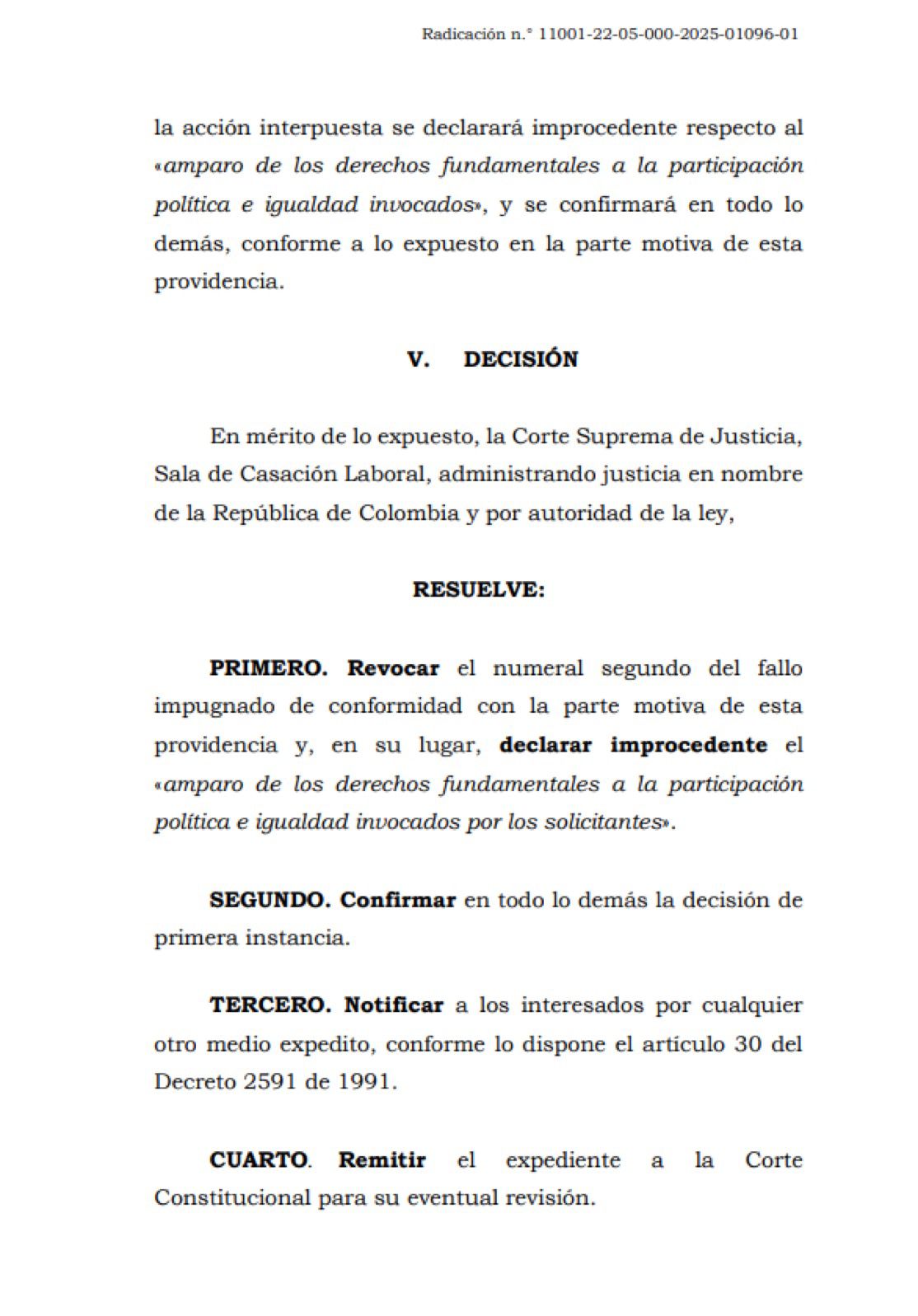 Con esta decisión la Corte revocó una parte de la decisión tomada en primera instancia, declarando que este no era el mecanismo adecuado para pedir el amparo al proceso administrativo y a la participación política de la unificación sin condicionamiento del Pacto.