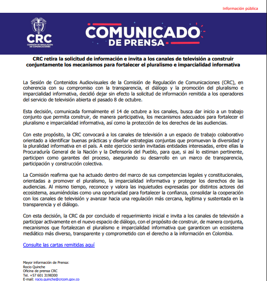 Con esta nueva normativa, la entidad ya no pedirá de manera obligatoria que los canales le brinden esta información, sino que abrirá un diálogo en conjunto y singular con cada red televisiva en pro de construir mecanismos que fortalezcan la diversidad de información en el país.