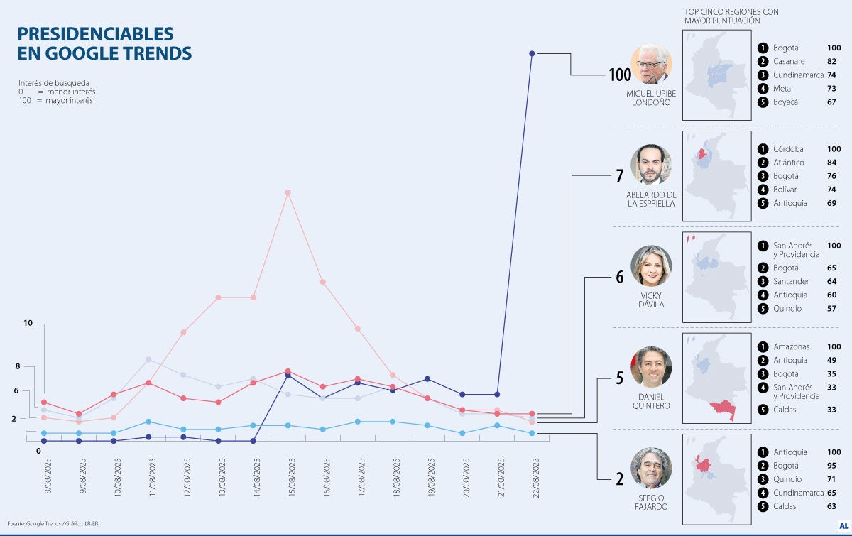 Se analizaron los datos de Miguel Uribe Londoño, Vicky Dávila, de La Espriella, Daniel Quintero y Sergio Fajardo en las últimas semanas