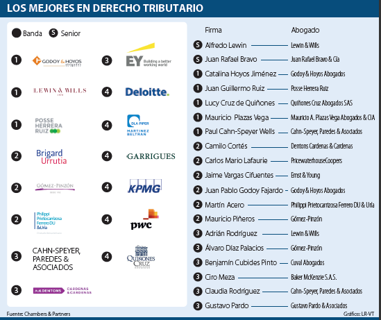 Para la primera banda en bufetes, la publicación destacó a Godoy y Hoyos Abogados, la firma que asesoró al Ministerio de Hacienda en la formulación de la Ley de Financiamiento de 2018, así como a Lewin & Wills y Posse Herrera Ruiz.