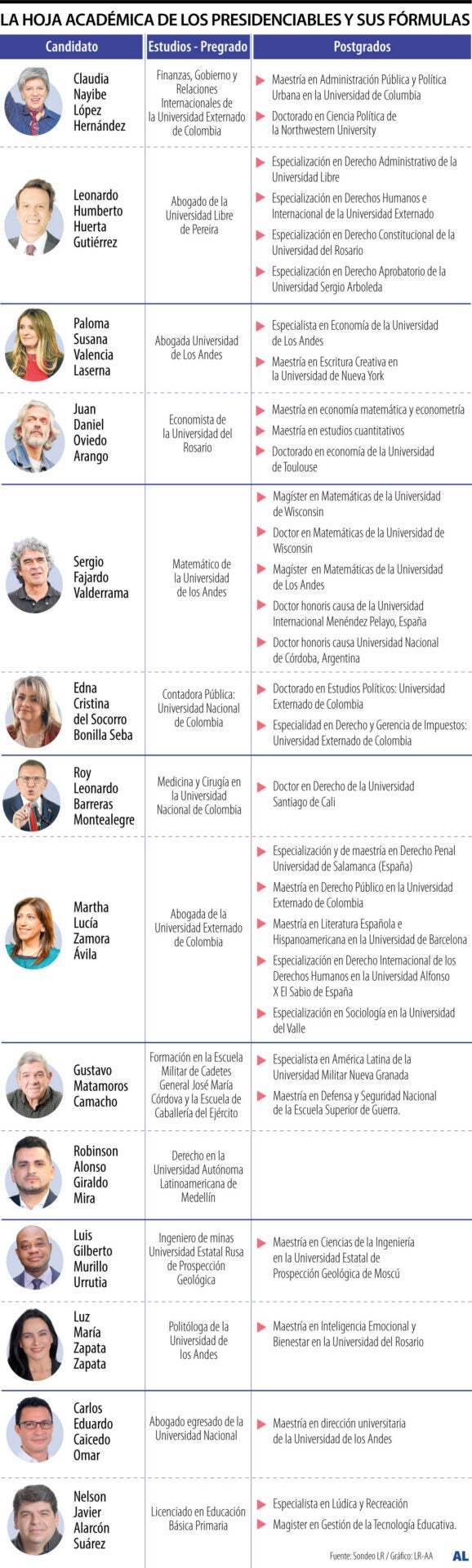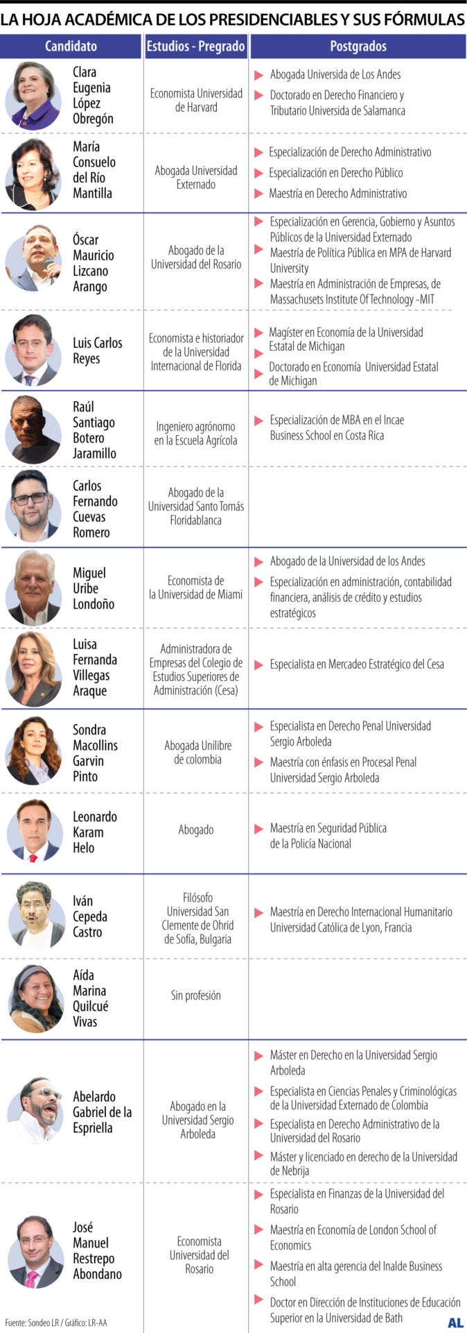 Los aspirantes presidenciales Clara López, Claudia López, Sergio Fajardo y Roy Barreras son los que llegaron un nivel académico de doctorado, así como las fórmulas vicepresidenciales Luis Carlos Reyes, José Manuel Restrepo, Juan Daniel Oviedo y Cristina del Socorro.