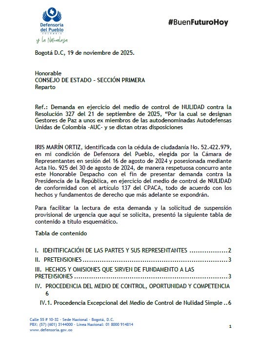 En una demanda radicada por la defensora del Pueblo, Iris Marín, ante el Consejo de Estado, pidió la nulidad de la Resolución 327 del 21 de septiembre de 2025, en la que se designaron como gestores de paz a ex miembros de la Autodefensas Unidas de Colombia, AUC.