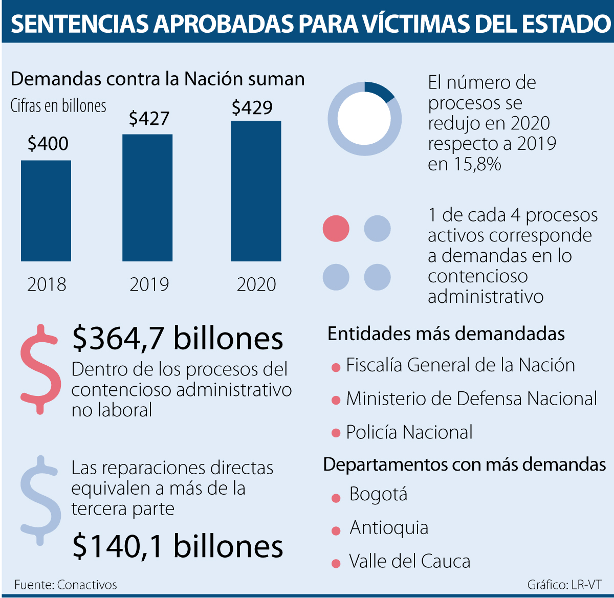 Las sentencias y conciliaciones aprobadas para víctimas del Estado han tenido mucha más relevancia en medio de la coyuntura causada por el covid-19. Las demandas contra la Nación han ido ascendiendo anualmente, pues mientras en 2018 había $400 billones en demandas, la misma cifra en 2020 llegó a $429 billones.