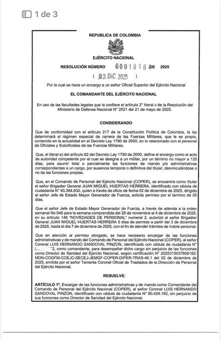 La Dirección decidió “encargar de las funciones administrativas y de mando como Comandante del Comando de Personal del Ejército Nacional (Coper), al señor Coronel Luis Fernando Sandoval Pinzón (...) quien continuará con sus funciones como Director de Sanidad del Ejército Nacional, Comunicado No. 804.426, en ejercicio de sus funciones como Director de Sanidad del Ejército Nacional”.