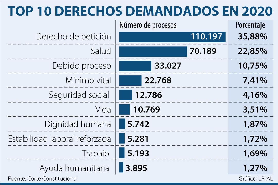 En el ranking publicado por la Corte Constitucional, el derecho a la salud fue el segundo más demandado por las personas. En 2020, hubo alrededor de 70.189 tutelas, que representaron 22,85% del total de los derechos fundamentales.