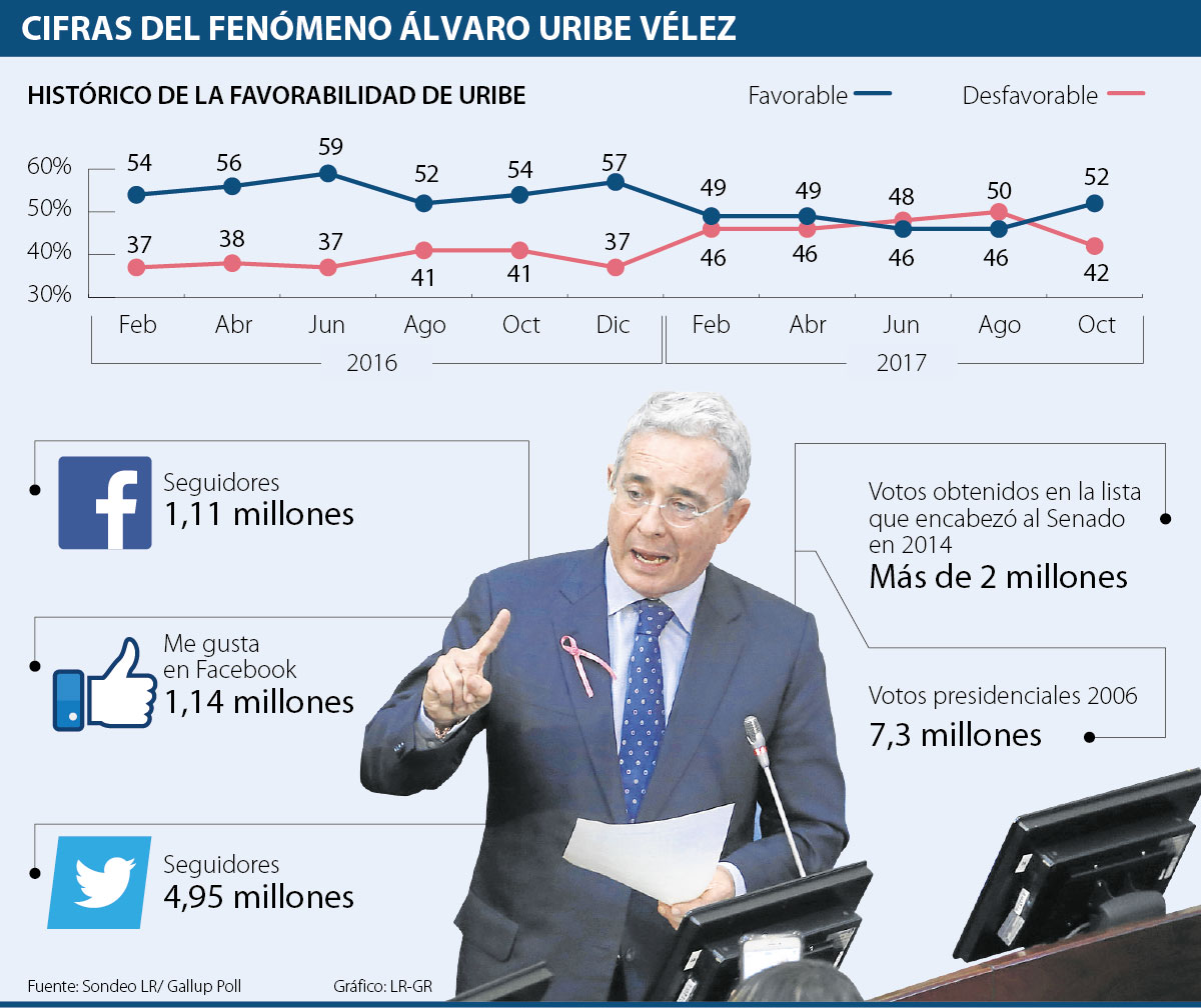 Pero la popularidad de Uribe no se limita a sus periodos presidenciales, ni solo a los dos millones de votos conseguidos en la lista cerrada del senado en 2014, sino también en la notoria participación que tiene en la vida política nacional y que se ve reflejada en las redes sociales, de las que es un usuario constante.
