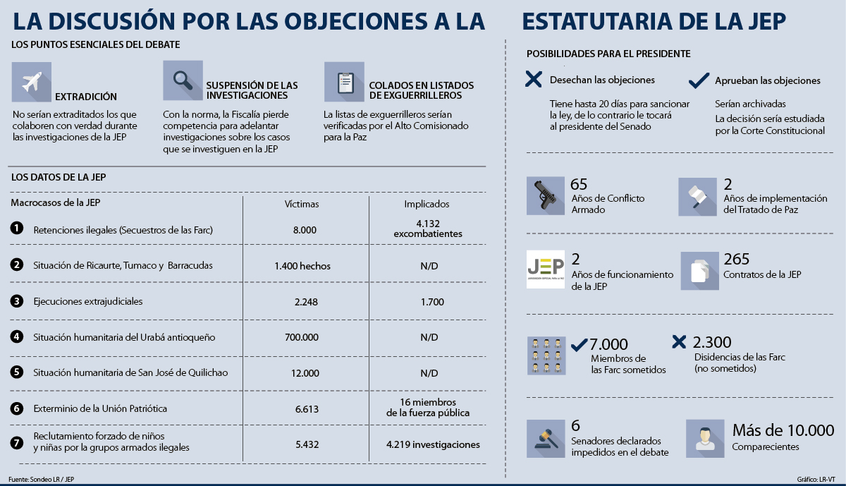 Otro de los puntos que también fueron objetados por inconveniencia es el que se relaciona con la entidad encargada de verificar los listados que entregaron las Farc en los procesos de desmovilización. Según estipuló la norma debatida, la entidad encargada de verificar estas listas es la JEP, sin embargo, las objeciones piden darle competencia al Alto Comisionado para la Paz.