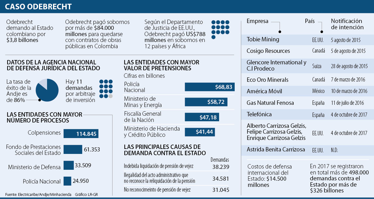 Ayer, el Estado colombiano sumó un pleito más por arbitraje de inversión con el anuncio de la predemanda de la constructora brasilera Odebrecht. Con este se completan 12 disputas legales que deberán ser frenados por el Gobierno entrante a la cabeza del presidente Iván Duque.