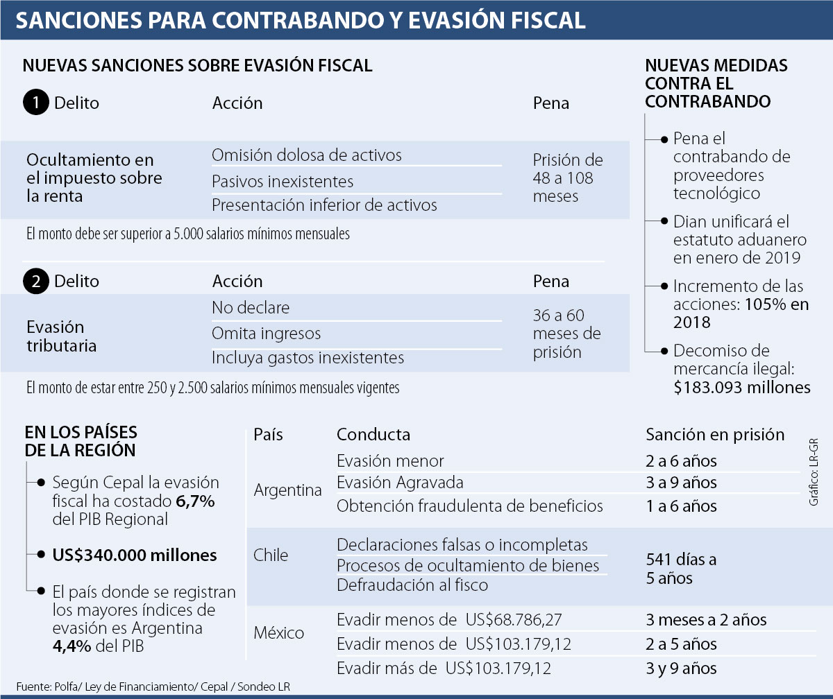 La reforma tributaria más reciente incluyó dos artículos que reformaron el Código Penal. En estas dos normas se estableció un castigo punitivo para las personas que no declaren renta o que presenten información falsa en este trámite tributario. Las penas privativas de la libertad van desde 48 a 108 años de prisión. Con esta nueva regulación, Colombia se suma a países como Chile, Brasil, Argentina, Perú y México donde la evasión fiscal es considerado un delito que debe ser pagado con cárcel.