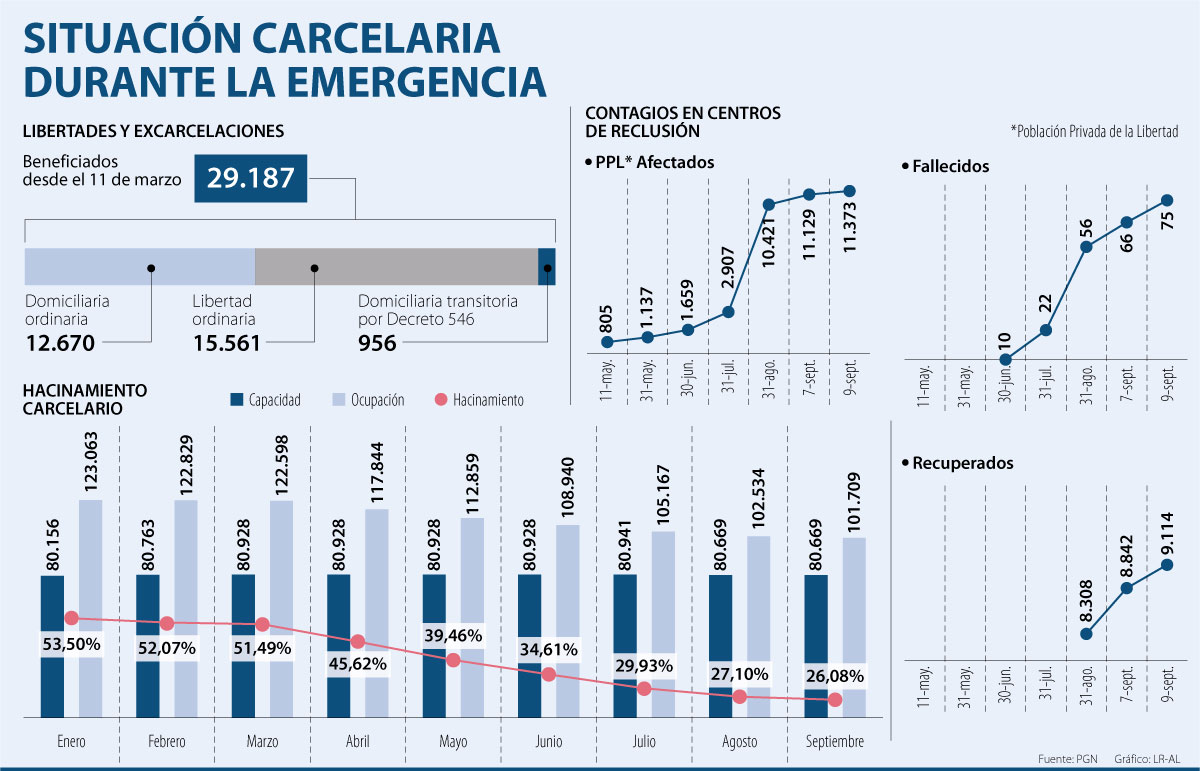 Sobre el panorama de covid-19 en centros de reclusión, el ente de control reportó que, con corte al 9 de septiembre, se habían registrado 11.373 reclusos afectados, 75 fallecidos y 9.114 recuperados. Además, destacó que la cifra de recuperados era de 80% y que se tomaron 27.969 pruebas covid-19, equivalentes a un muestreo de 28,5% de la población carcelaria.
