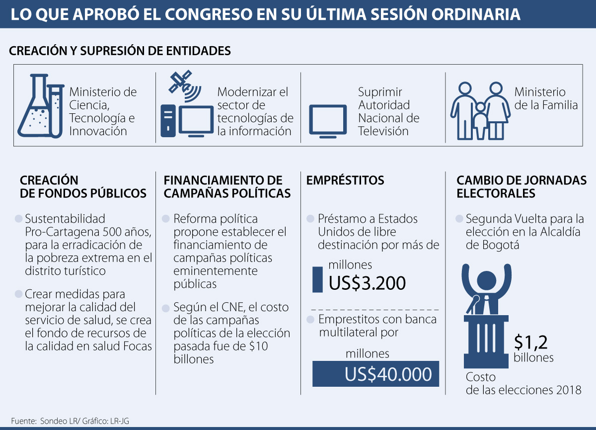 La reforma política; el proyecto que crea el Ministerio de Ciencia, Tecnología e Innovación y la modificación del calendario electoral para imponer una segunda vuelta para la Alcaldía de Bogotá fueron algunos de los proyectos que aprobaron los legisladores en esta jornada que concluyó el domingo pasado.