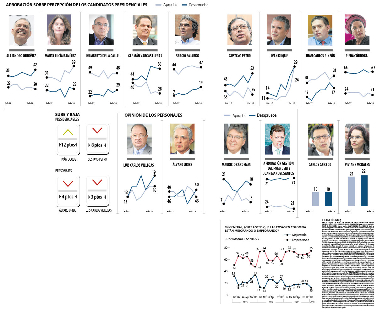 Marta Lucía Ramírez y Humberto de la Calle candidatos de los dos partidos tradicionales, Liberal y Conservador, registraron 39% y 48% de imagen favorable, respectivamente, y repuntaron frente a las consultas anteriores. Germán Vargas Lleras, por otro lado, bajó un punto porcentual frente al sondeo de diciembre, pero su imagen desfavorable se mantiene alta, con 56% de imagen negativa entre los que respondieron el sondeo. Sergio Fajardo ha mantenido su imagen favorable en 47% desde el último sondeo y el candidato Iván Duque sorprendió al subir de 17% a 29% en el sondeo de febrero.