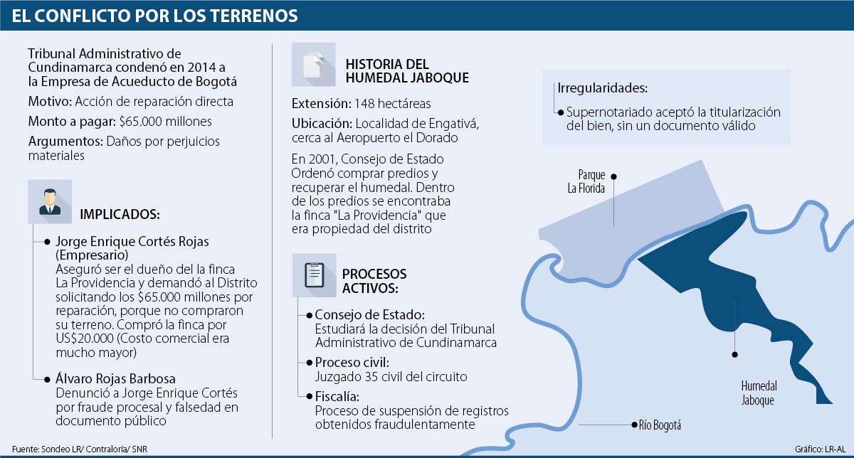 En un conflicto jurídico que inició hace cuatro años, el Distrito está batallando para recuperar los terrenos del humedal Jaboque. Debido a una demanda interpuesta contra la Empresa de Acueducto y Alcantarillado de Bogotá, en este momento la ciudad debe pagar más de $65.000 millones por no comprar unos terrenos que, según los registros históricos, le pertenecen a Bogotá desde hace 50 años.