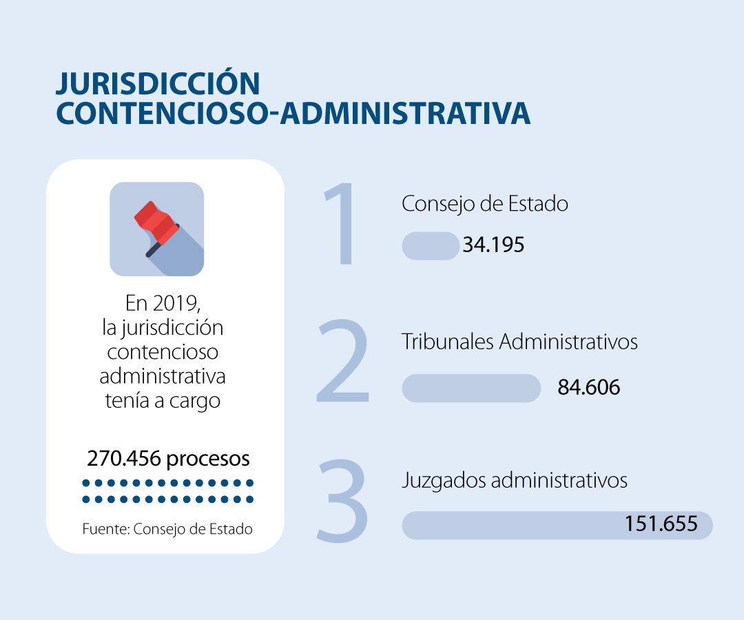 Por otro lado, Álvaro Námen, el presidente del Consejo de Estado, reveló que en 2019 la jurisdicción contenciosa administrativa tenía a cargo 270.456 procesos de los cuales 34.195 pertenecen a la Corporación y 84.606 se encuentran en los tribunales administrativos, el resto está en los juzgados administrativos (ver infografía).