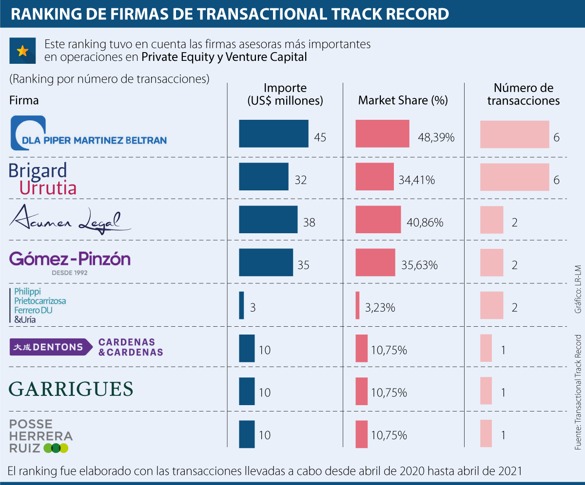 Por el número de operaciones, DLA Piper Martínez Beltrán (6), Brigard Urrutia (6) y Acumen Legal (2) ocuparon los tres primeros escalafones del listado publicado. También se dio a conocer cuáles fueron las firmas con el mayor capital movilizado por asesoramiento transaccional, podio que se completó de la siguiente manera: DLA Piper Martínez Beltrán (US$45 millones), Acumen Legal (US$38 millones) y Gómez Pinzón (US$35 millones).