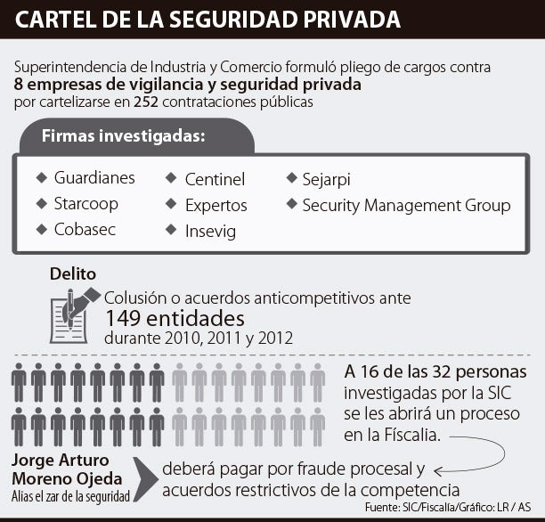 El 28 de enero de 2015, la Superintendencia de Industria y Comercio (SIC) formuló pliego de cargos contra ocho empresas de vigilancia y seguridad privada (Guardianes, Starcoop, Cobasec, Centinel, Expertos, Insevig, Sejarpi, Security Management Group) que presuntamente se cartelizaron en 252 procesos de contratación pública, adelantados ante 149 estatales en todo el territorio nacional entre 2010 y 2012.