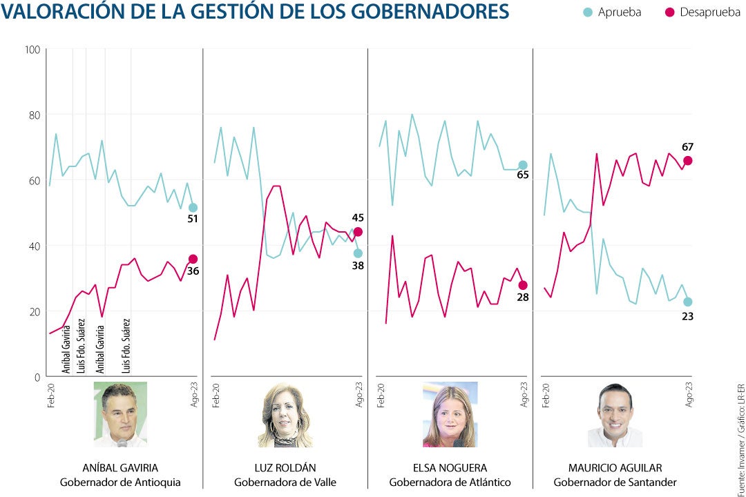 Después de ella, le sigue el gobernador de Antioquia, Aníbal Gaviria, quien logró la segunda mejor aprobación a pesar de caer de 59% en la encuesta de junio a 51% en la presentada en agosto.