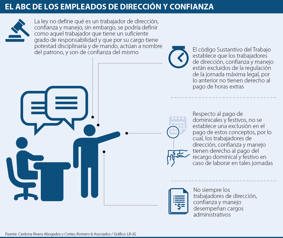 Según José Luis Cortés Perdomo, socio de Cortés, Romero & Asociados, el Código Sustantivo del Trabajo establece que los trabajadores de dirección, confianza y manejo están excluidos de la regulación de la jornada máxima legal, por lo anterior no tienen derecho al pago de horas extras.