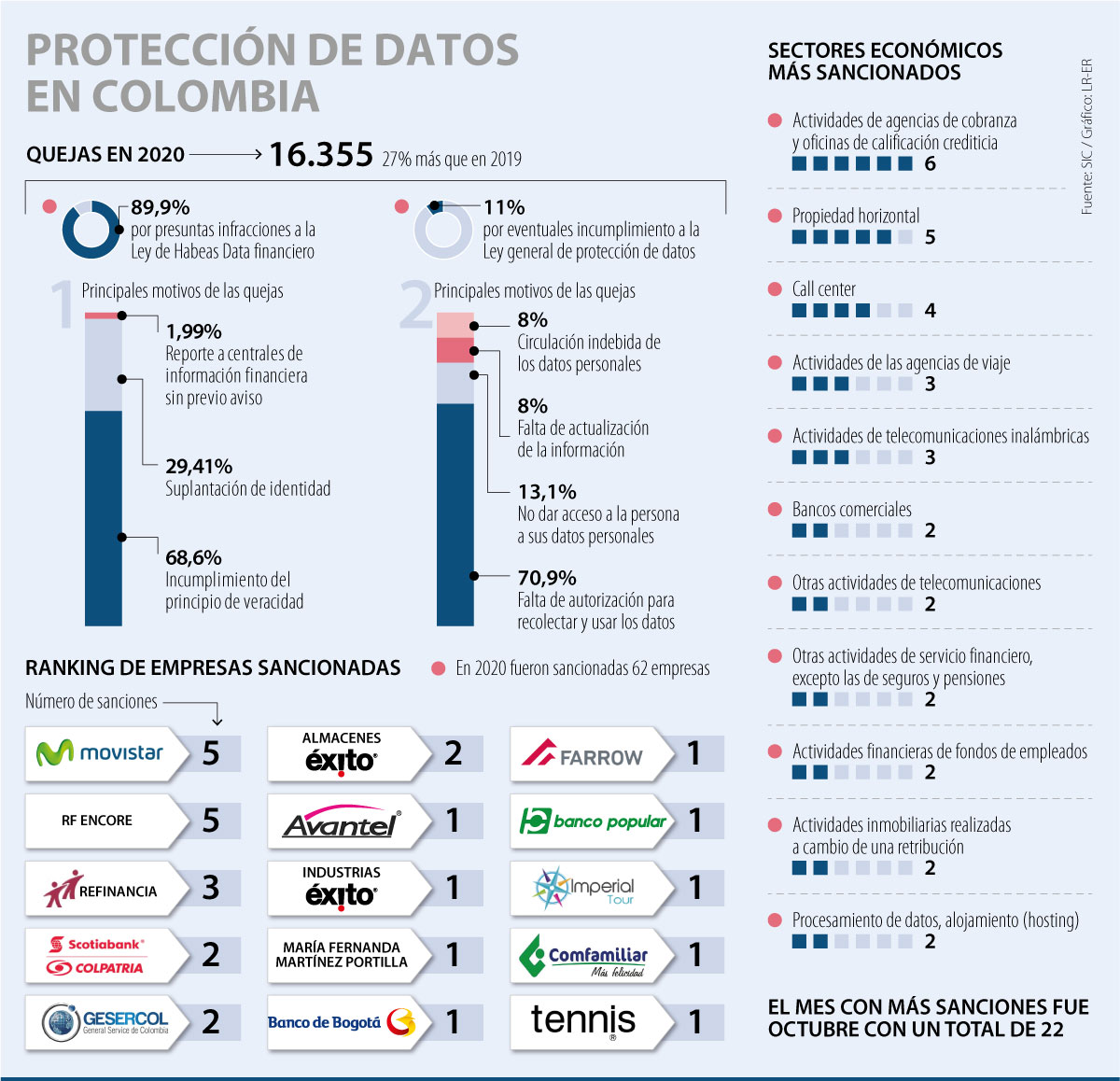Tras el análisis de esas denuncias, 64 empresas fueron sancionadas por incumplir los parámetros que están amparados en la Ley de Habeas Data Financiero y la Ley general de protección de datos, siendo Colombia Telecomunicaciones (Movistar Colombia) y RF Colombia (dedicada a actividades de compra de cartera o factoring) las que mayor número de sanciones acumularon con 5 cada una. Refinancia y Scotiabank Colpatria siguen en el ranking con 3 y 2 sanciones, respectivamente.