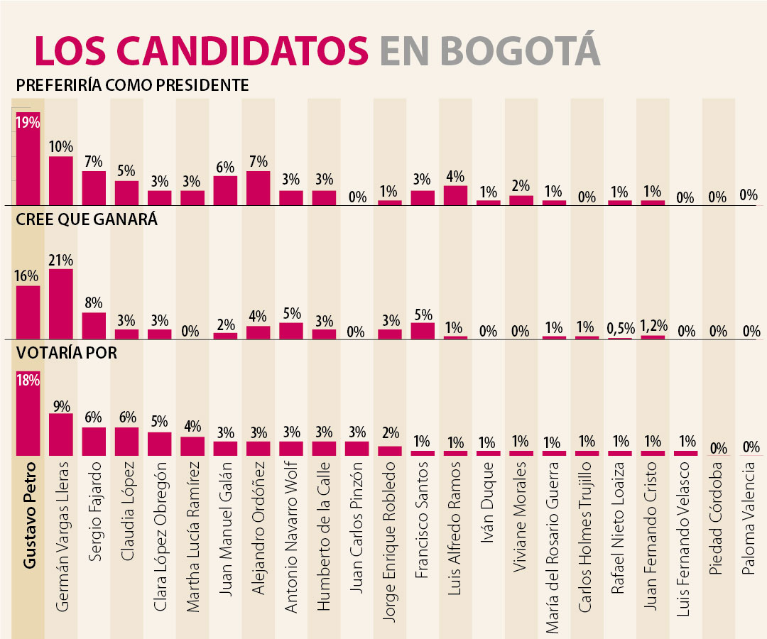 Cerca de dos de cada 10 capitalinos (19%) preferirían que el exalcalde Gustavo Petro fuera el próximo Presidente. Sin embargo, la diferencia en el deseo de tener como primer mandatario a Petro frente a Vargas Lleras, un candidato que tiene bastante fuerza en las demás regiones del país, no es tan grande, pues este obtuvo 10% de preferencia en la capital. A su vez, este deseo contrasta con Fajardo y López, que tienen 7% y 5%, respectivamente.