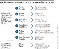 En ese sentido, se cuestiona la actuación de la Contraloría, que "llega el día de la sesión del Ocad-Paz y bajo as de la manga" presenta los proyectos con repartos. Cabe recordar que en el centro del escándalo, que apunta al presunto cobro de coimas de $500.000 millones para direccionar los recursos del Ocad-Paz, hay tres nombres mencionados de manera recurrente: Aníbal Quiroz, contralor delegado de la Unidad de Regalías; Juan Carlos Gualdrón, contralor delegado para el posconflicto; y Álvaro Ávila, director del Sistema General de Regalías (SGR) del Departamento Nacional de Planeación (DNP).