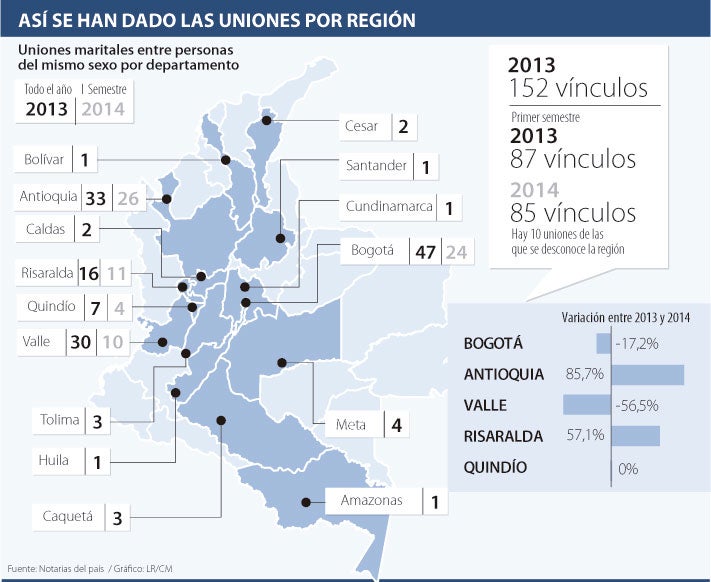 Al cierre del año pasado, la cifra fue de 152 parejas y las regiones que más reportaron el trámite legal, fueron Bogotá con 29, Antioquia, 14, y Valle, 23. Este año va repuntando el departamento paisa con 26 celebraciones.
