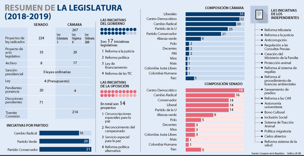 En esta legislatura se radicaron 465 proyectos de ley y 56 actos legislativos. El Gobierno actual presentó 17 iniciativas, que incluyeron las reformas tributaria, de justicia y de política electoral. Según recortó el Diario Oficial, en lo corrido de 2018 se han promulgado 63 leyes, pero, en estos primeros tres meses del Gobierno Duque tan solo se han promulgado cuatro.