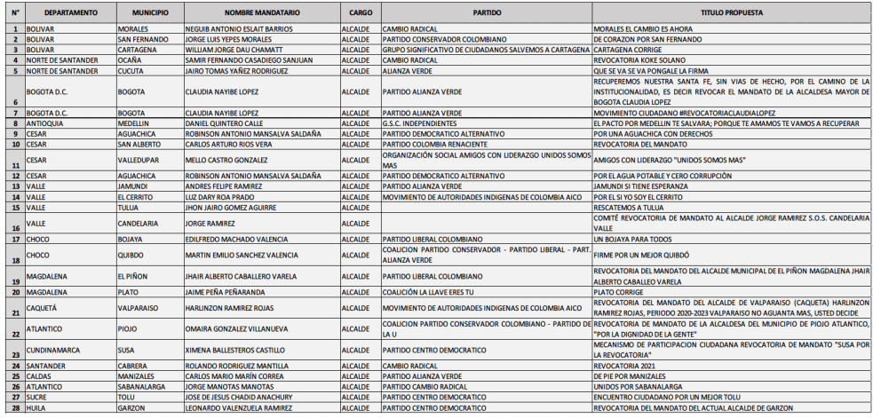 En lo que va corrido del 2021, la Registraduría Nacional del Estado Civil y el Consejo Nacional Electoral recibieron la inscripción de 28 comités promotores de revocatoria, que buscan dar por terminado el mandato que le confirieron a Alcaldes, por los siguientes motivos: