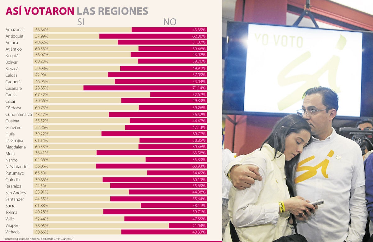 En Santander, la tierra del exprocurador Alejandro Ordóñez, ganó el no con 55,64% contra 44,35%, representados en 714.669 votos de 1,6 millones de personas habilitadas para hacerlo. En Antioquia, en donde hay un fuerte apoyo al expresidente Álvaro Uribe, ganó el no con 62%, contra 37,99%.
