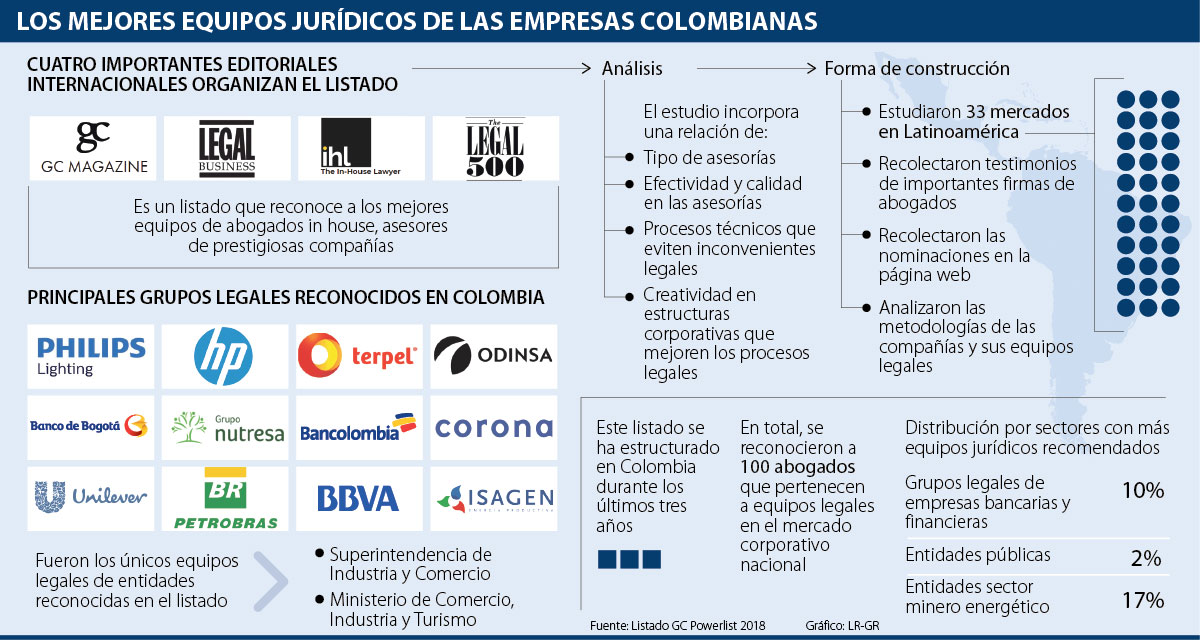Baker Mckenzie y la editorial Legal 500 publicaron el GC Powerlist, un listado que busca reconocer la labor de los abogados in house de grandes empresas que ejecutan su actividad comercial en Colombia. En total, fueron reconocidos más de 100 equipos jurídicos que se encargan de representar los intereses legales de importantes compañías como Corona, Bancolombia, Isagen, Terpel, Bbva o HP, entre otros. La editorial destacó la clase de asesorías prestadas y la estructuración de procesos eficientes, desde el ámbito jurídico.