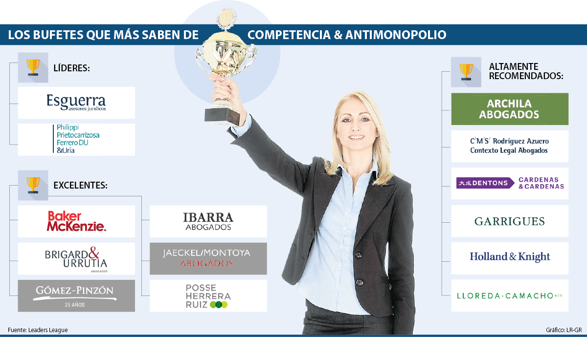 Según el listado 2017 de Leaders League, Philippi Prietocarrizosa Ferrero DU & Uría y Esguerra Asesores Jurídicos son los bufetes que más crédito se llevan en la práctica de competencia, seguidas de otras firmas calificadas como excelentes, como Baker McKenzie, Brigard & Urrutia, GPA e Ibarra Abogados.
