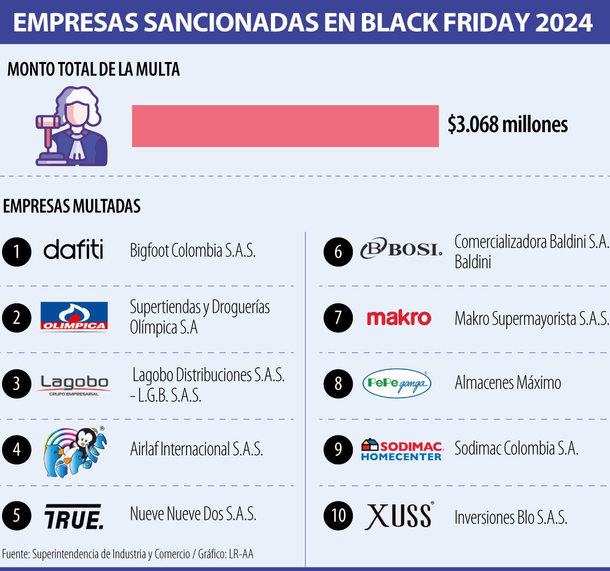 Las 10 empresas sancionadas fueron Bigfoot Colombia S.A.S., operadora de la tienda en línea Dafiti Colombia; Supertiendas y Droguerías Olímpica S.A., matriz de Olímpica; Lagobo Distribuciones S.A.S., cadena pereirana dedicada a la venta de electrodomésticos y muebles para el hogar bajo la marca Almacenes Oportunidades; Airlaf Internacional S.A.S., comerciante al por menor de prendas de vestir y accesorios; Nueve Nueve Dos S.A.S., dedicada al comercio minorista a través de internet; Comercializadora Baldini S.A., propietaria de la marca Bosi; Makro Supermayorista S.A.S.; Almacenes Máximo, conocido como Pepe Ganga; Sodimac Colombia S.A.; e Inversiones Blo S.A.S., reconocida como Tiendas Xuss.