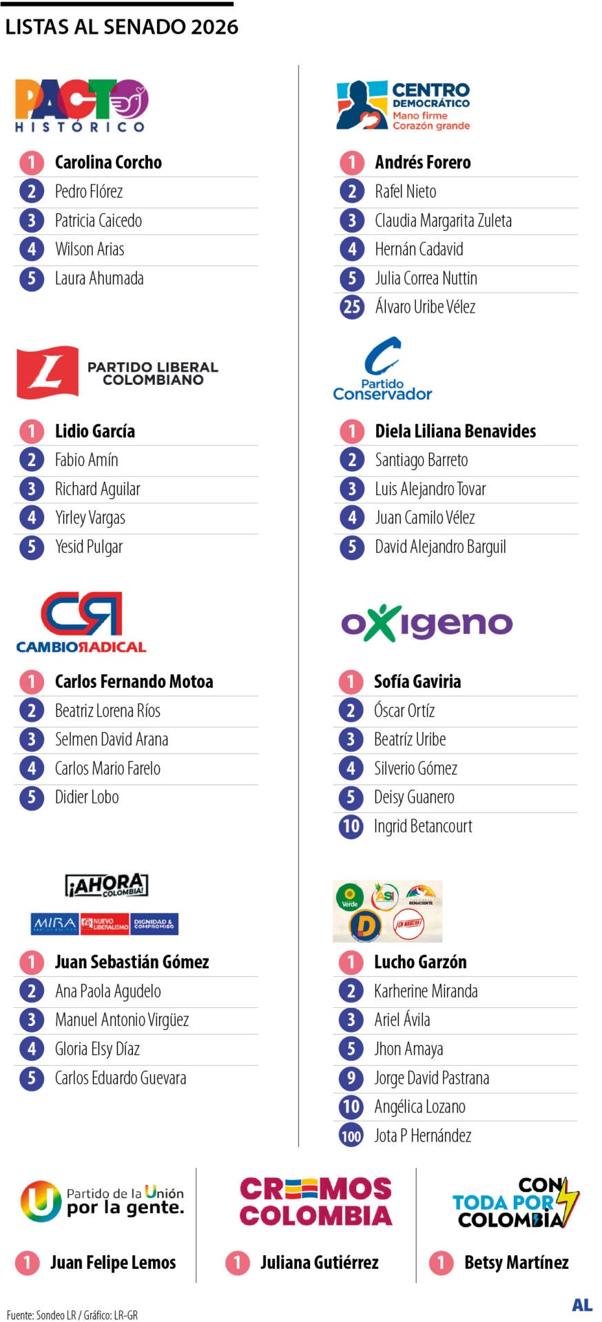 Finalmente, hay tres partidos que aún no han confirmado sus listas completas, pero sí los nombres de sus cabezas: el Partido de la U eligió a Juan Felipe Lemos; el movimiento Creemos a Betsy Martínez; y el movimiento de Juan Daniel Oviedo, candidato a la Presidencia, a Betsy Martínez.