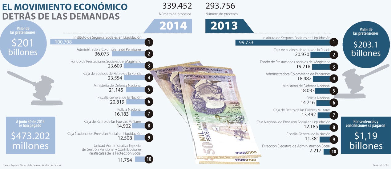 El Instituto de Seguros Sociales en Liquidación, la Administradora Colombiana de Pensiones, el Fondo de Prestaciones Sociales del Magisterio, la Caja de Sueldos de Retiro de la policía, el Ministerio de Defensa Nacional, la Fiscalía General de la Nación, la Policía Nacional, la Caja de Retiro de las Fuerzas Militares, la Caja Nacional de Previsión Social en Liquidación y la Unidad Administrativa Especial de Gestión Pensional y Contribuciones Parafiscales de la Protección Social conforman el grupo de las entidades públicas que más demandas en su contra acumularon en los primeros seis meses del año. Hasta la fecha hay 293.756 procesos que suman un total de $203,1 billones, de los cuales se han pagado $473.202 millones.