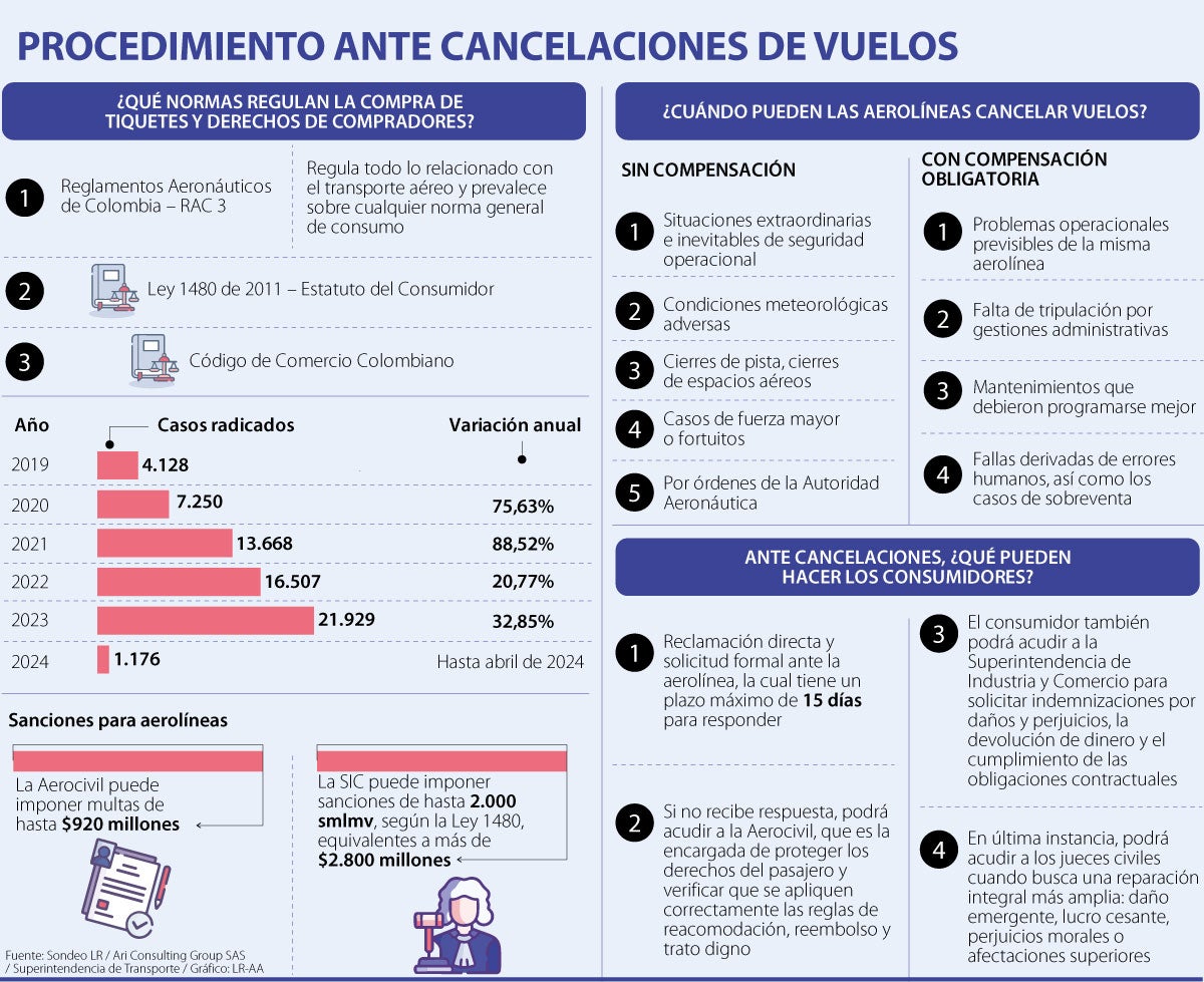 Ante cancelaciones sin previo aviso, las aerolíneas deben cumplir ciertas acciones de reparación: si el viaje no ha iniciado, el consumidor puede solicitar la devolución del dinero y la empresa deberá reembolsar el total del valor del tiquete; pero, si el viaje ya comenzó, la aerolínea “deberá cubrir los gastos razonables de hospedaje, alimentación y manutención que genere la interrupción, salvo que el pasajero prefiera el reembolso del trayecto no volado”, señaló Téllez.