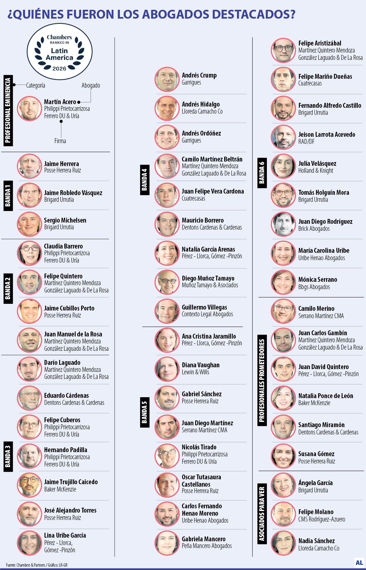 Los abogados destacados en la banda 4 de Chambers and Partners fueron Andrés Crump, de Garrigues; Andrés Hidalgo, de Lloreda Camacho; Andrés Ordóñez, de Garrigues; Camilo Martínez Beltrán, de Martínez, Quintero, Mendoza, González, Laguado & De La Rosa; Juan Felipe Vera Cardona, de Cuatrecasas; Mauricio Borrero, de Dentons Cardenas & Cardenas; Natalia García Arenas, de Pérez-Llorca, Gómez-Pinzón; Diego Muñoz Tamayo, de Muñoz Tamayo & Asociados; y Guillermo Villegas, de Contexto Legal Abogados.