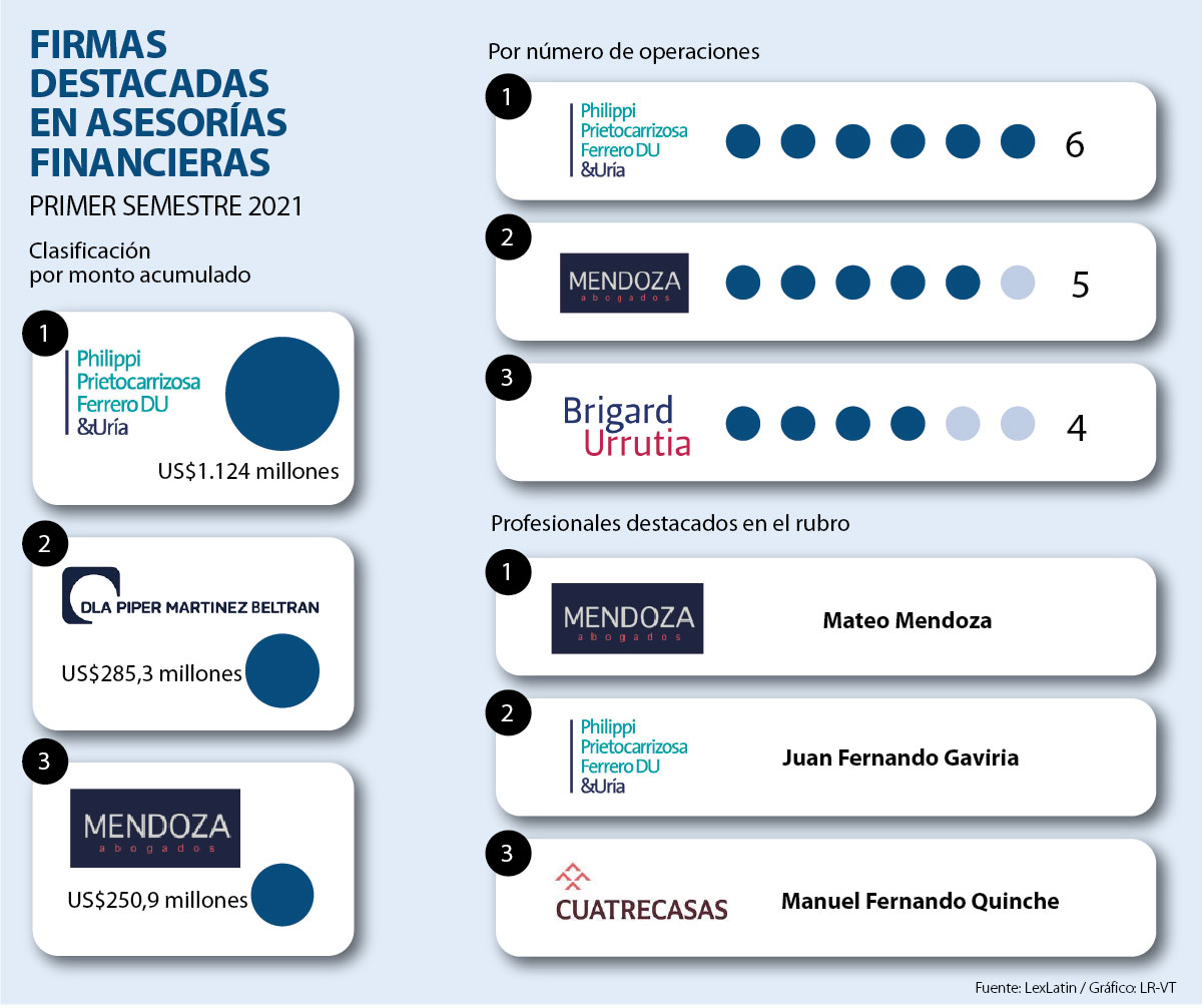 El estudio reveló que las tres firmas que ocuparon los primeros lugares por el monto acumulado en asesoría de los proyectos de financiamiento fueron Philippi Prietocarrizosa Ferrero DU & Uría (US$ 1.123 millones), DLA Piper Martínez Beltrán (US$285 millones) y Mendoza Abogados (U$250 millones).