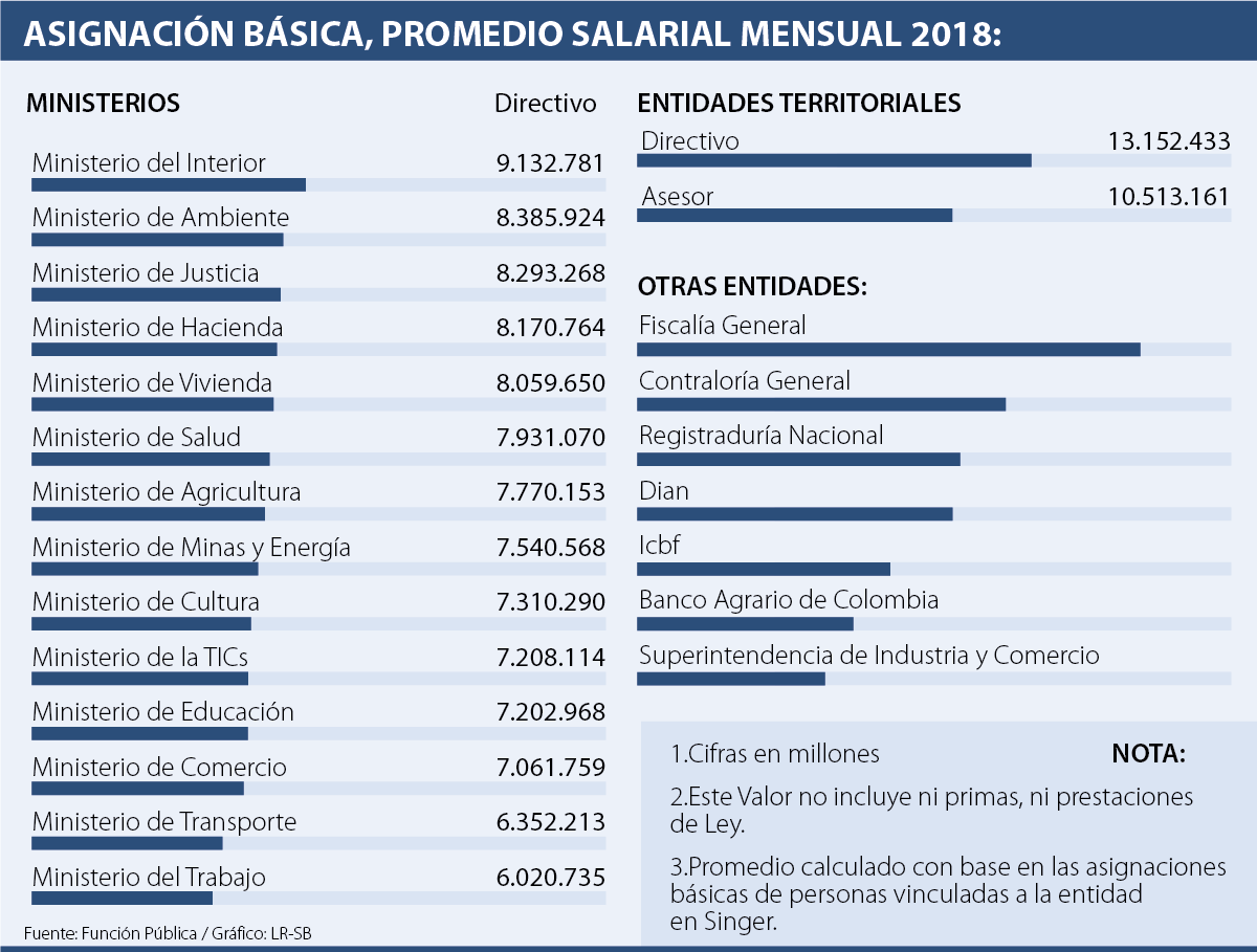 En un informe del Departamento Administrativo de la Función Pública se puede revisar los promedios de los salarios de los directivos de entidades como Ministerios, Fiscalía, Dian, Registraduría, entre otros. Este informe no tiene en cuenta ni primas, ni prestaciones de Ley y es calculado con base en las asignaciones básicas vinculadas a la entidad.