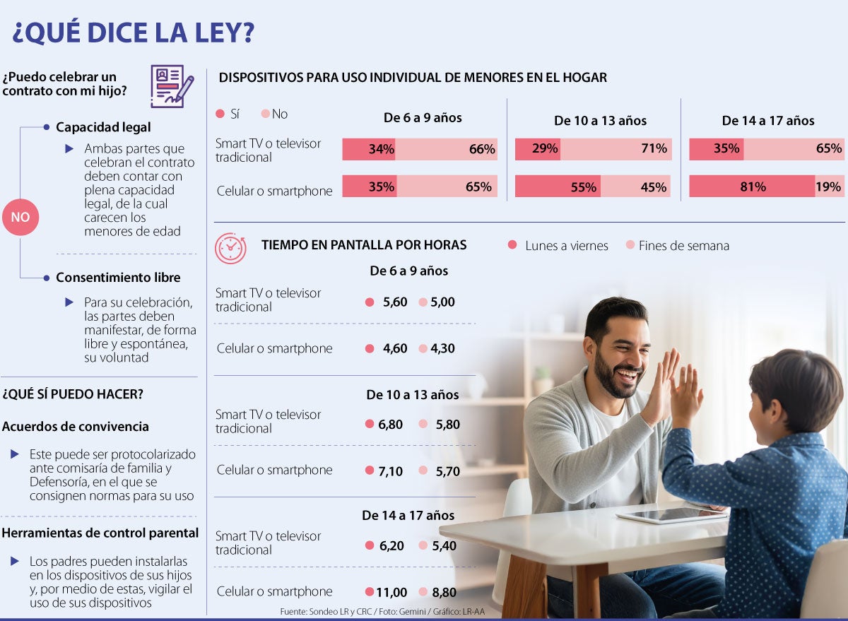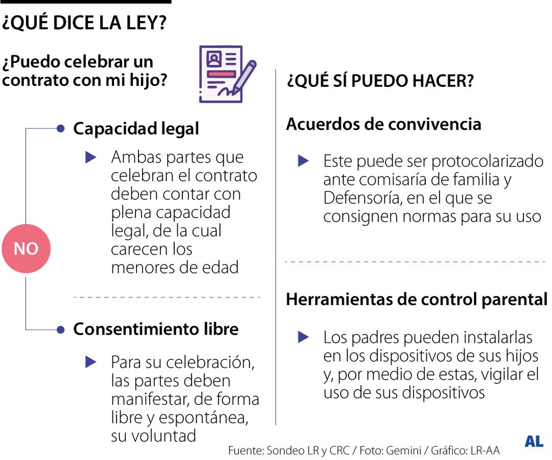 El primero de ellos es el acuerdo de convivencia familiar, el cual puede ser protocolarizado ante la comisaría de familia y la Defensoría del Pueblo. En este documento, se pueden consignar el conjunto de normas y compromisos a los que se acogerán ambas partes: cuál es el horario permitido para el uso de los dispositivos electrónicos; cuáles son las aplicaciones o redes sociales a las que los menores sí podrán acceder; con qué personas, ajenas a la familia, el menor podrá mantener contacto por medio de su teléfono, y cuáles serán las contraseñas de cada uno de los perfiles y plataformas.
