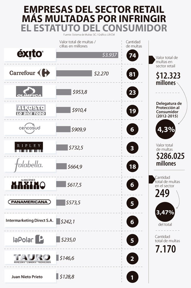 Empresas La Polar; Centromayorista Papelero Tauro y la persona natural, Juan Nieto Prieto, culminan el ranking de las empresas del sector retail más multadas (de las 200 estudiadas); con $235 millones; $146,6 millones y $128, 8 millones. Las multas sumaron $12,323 millones, lo que representó 4,3% del total de multas $286.025 impuestas por la SIC.