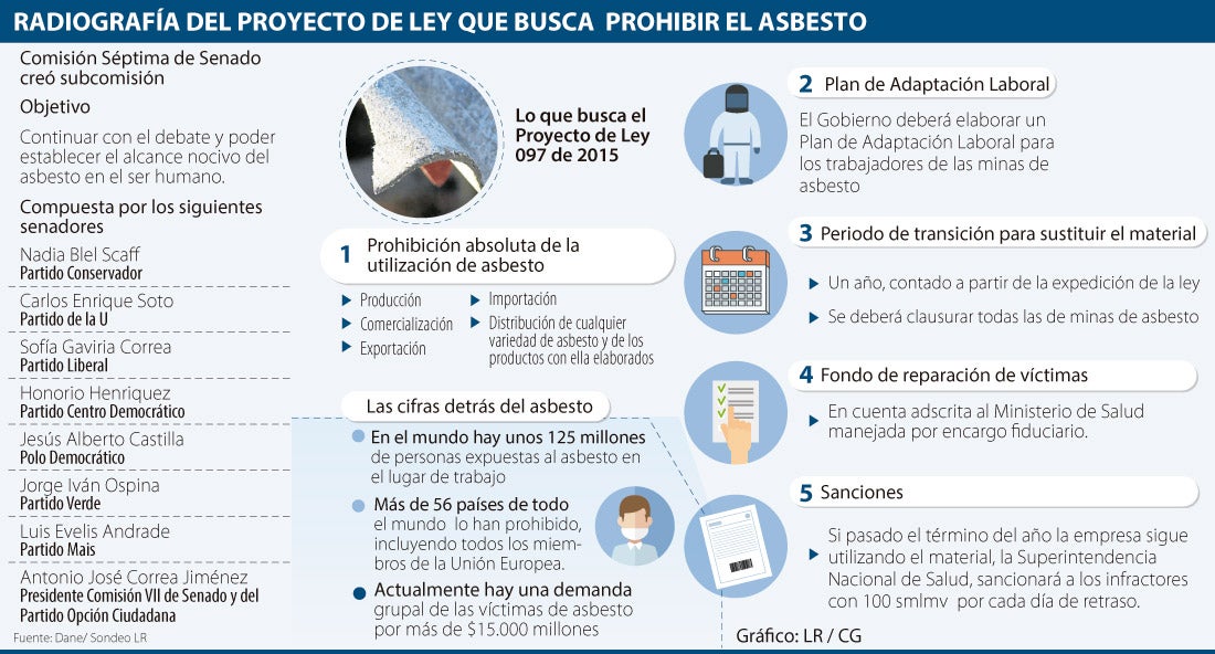 De acuerdo Scaff en Colombia cerca de 320 personas mueren al año como consecuencia del mineral y sí hay estudios de organizaciones internacionales como la Organización Mundial de la Salud (OMS) que evidencian que el asbesto es nocivo para las personas. “No por nada este mineral está prohibido en más de 50 países del mundo”, declaró la impulsora del proyecto.