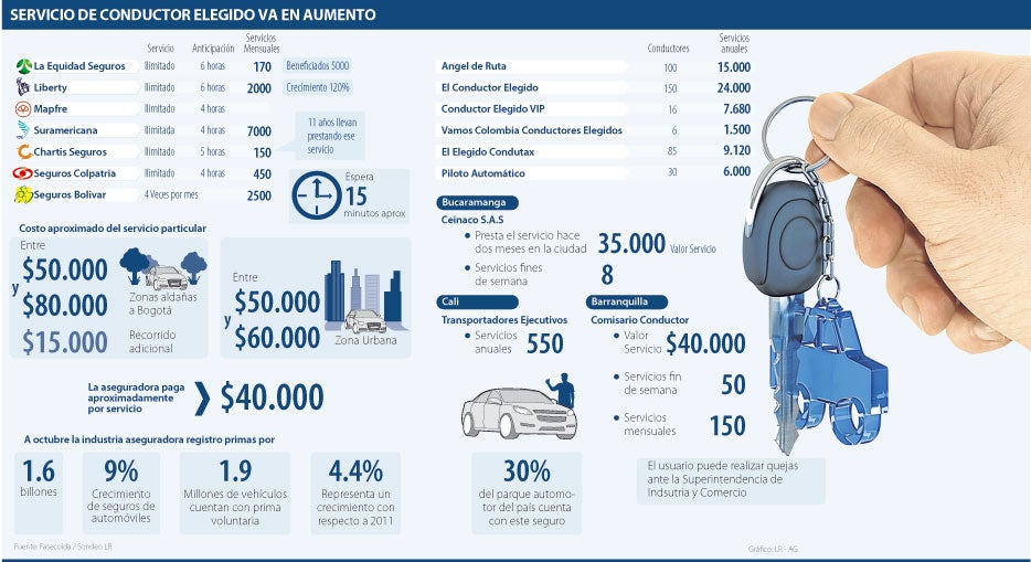 En cuanto a los seguros de automóviles y los servicios adicionales que ofrecen las aseguradoras, Carlos Varela, director de la Cámara de Automóviles de Fasecolda, recomendó a los usuarios verificar si el seguro que poseen cuenta con el servicio de asistencia y pedir asesoría de cómo pueden utilizarlo. “Existen productos en donde se requiere que la persona avise con al menos 24 horas de anticipación y otros con al menos dos o tres horas, informando a dónde va a estar, cuándo debe presentarse el conductor y el lugar de destino. Casi todos estos servicios permiten sólo un trayecto, es decir, desde el origen se conduce hasta sólo un destino dentro del área metropolitana”, puntualizó.