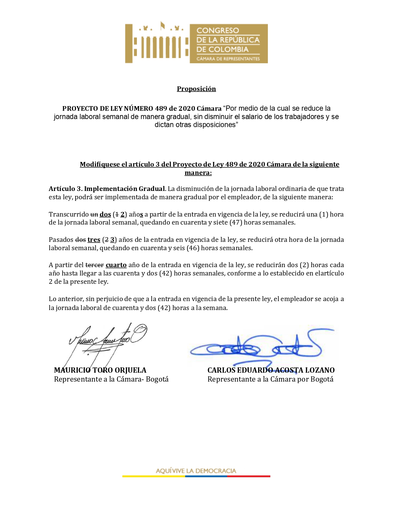 Hasta el momento, la Cámara de Representantes aprobó en último debate la ley que además, específica, que con esto no se tocará los salarios de los trabajadores, es decir, trabajarán menos horas pero por igual salario.
