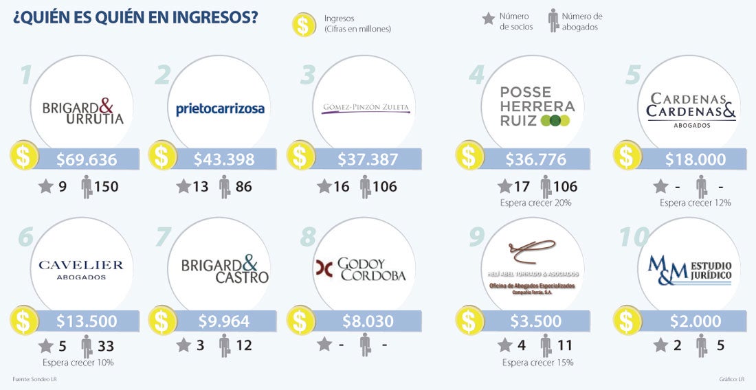 En el top tres de los pesos pesados de las leyes y la facturación se metieron Brigard & Urrutia,$69.636 millones; prietocarrizosa, $43.398 millones; y Gómez Pinzón Zuleta con $37.387 millones.