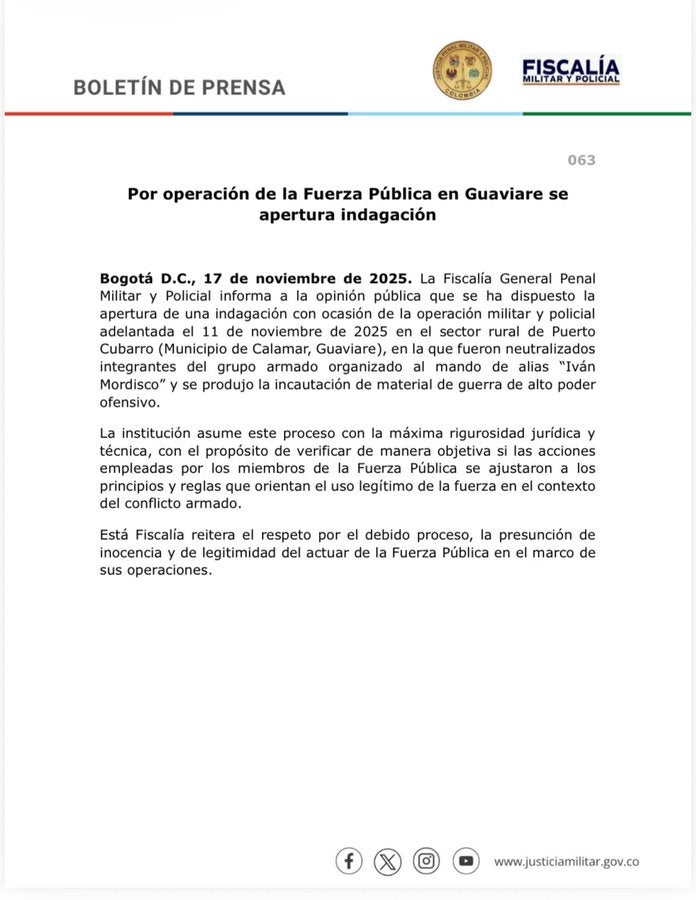 La Fiscalía Penal Militar y Policial abrió una investigación a la operación que se desarrolló en Puerto Cubarro, Calamar, Guaviare, en la que se bombardearon disidencias de Iván Mordisco y se incautó material de guerra de alto poder.