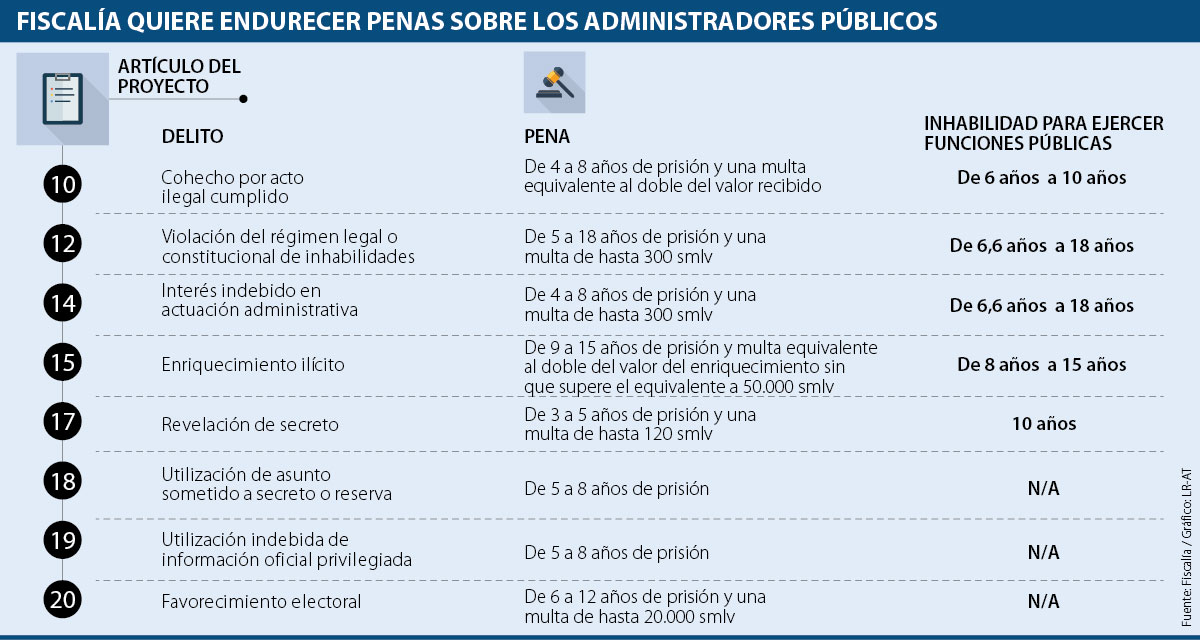 Por ejemplo, en el texto que fue radicado por el fiscal Néstor Humberto Martínez, se considera elevar varias penas como es el caso del enriquecimiento ilícito, pues, actualmente, se contempla una pena de seis a diez años, mientras que ahora será de ocho a 15 años, con una multa de hasta 50.000 salarios mínimos; o subir de tres a cinco años de prisión el hecho de revelar información indebidamente que deba mantener en secreto o reserva.